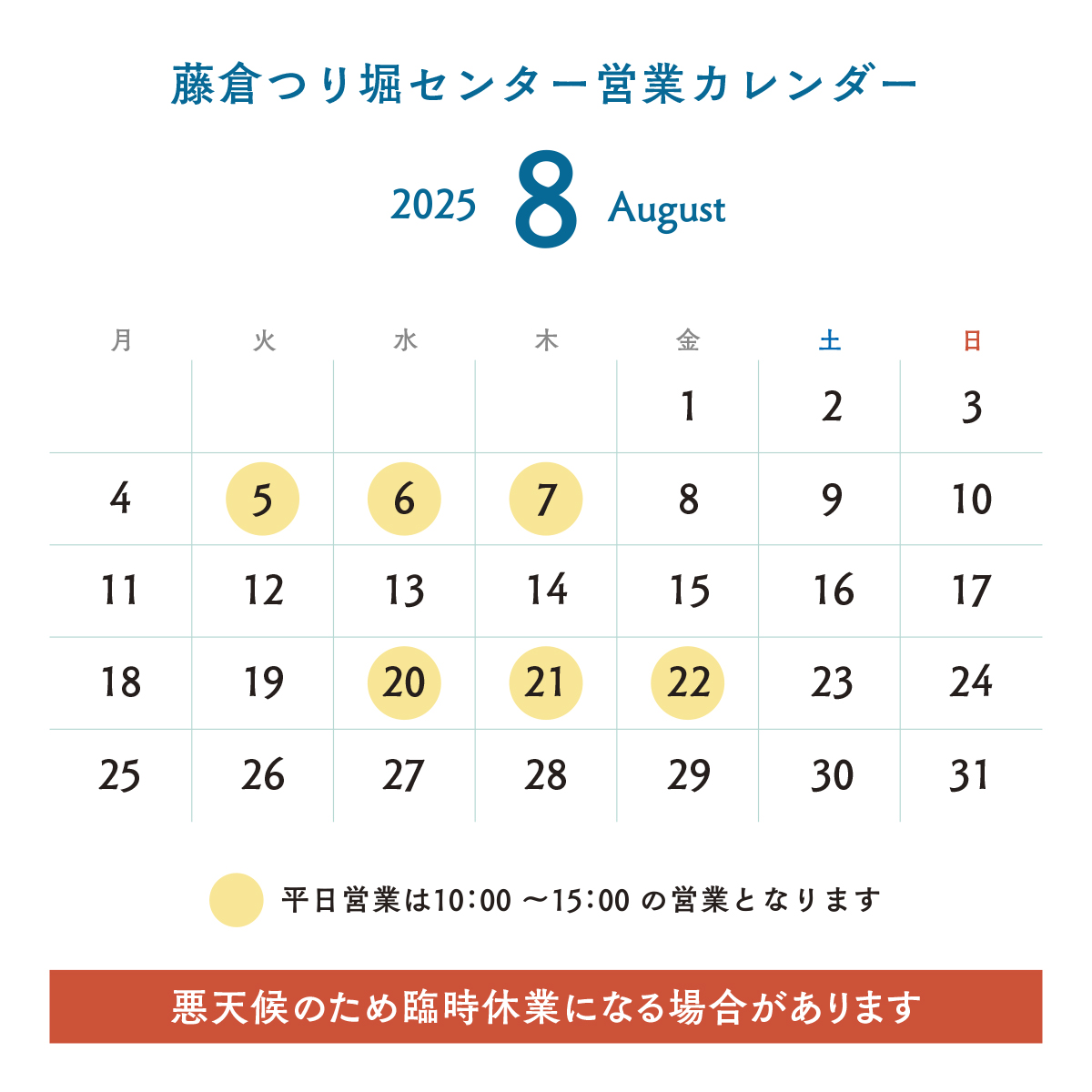なお、代わりといっては何ですが、8月20日(水)〜22日(金)は平日営業いたします。